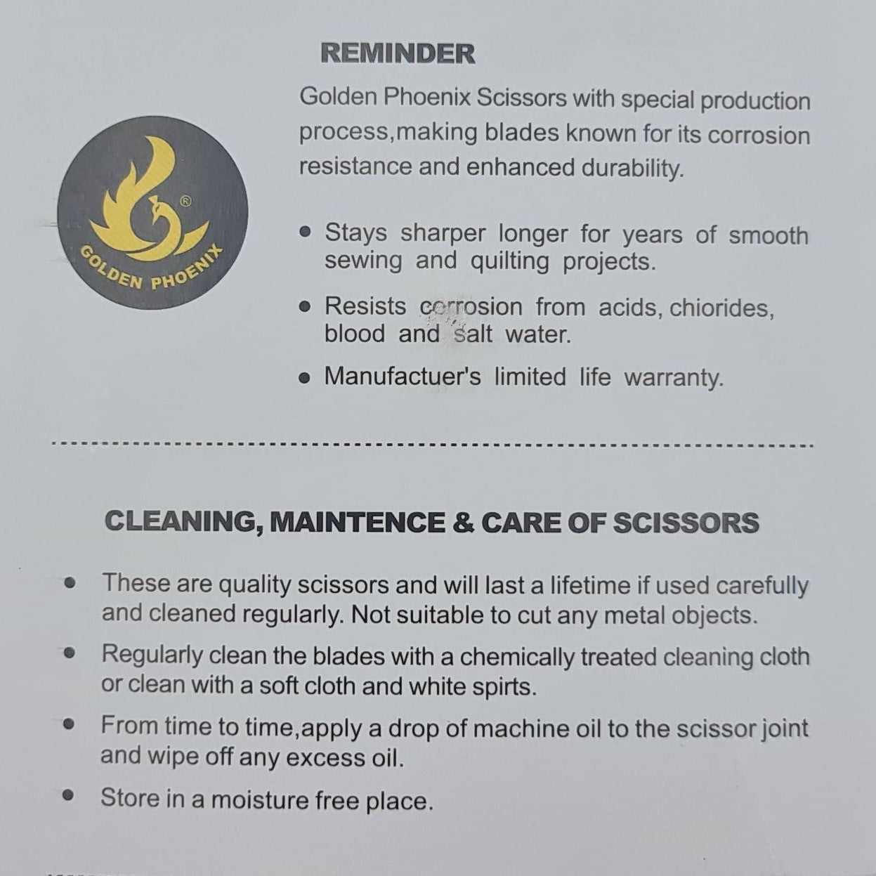 - Kaliteli makaslardır ve dikkatli kullanıldığında ve düzenli olarak temizlendiğinde ömür boyu dayanır. Herhangi bir metal nesneyi kesmeye uygun değildir