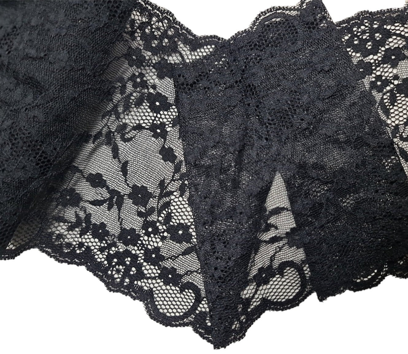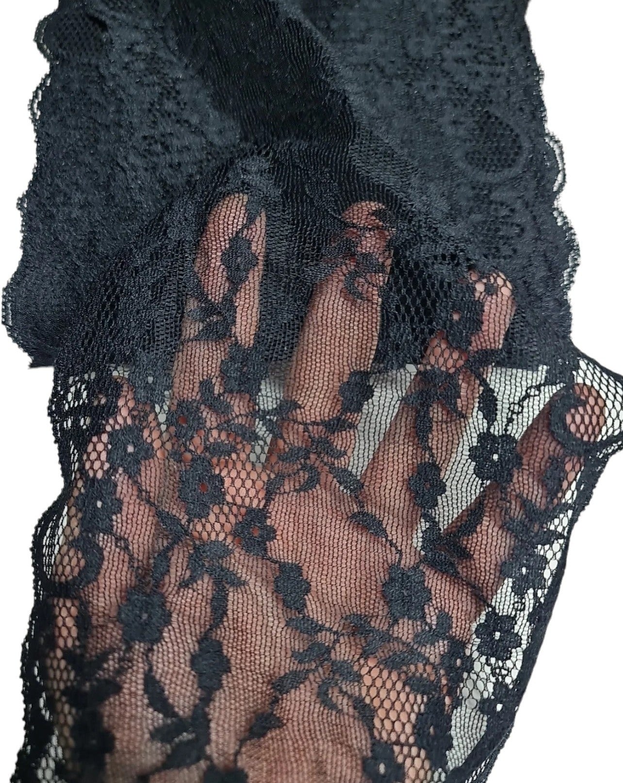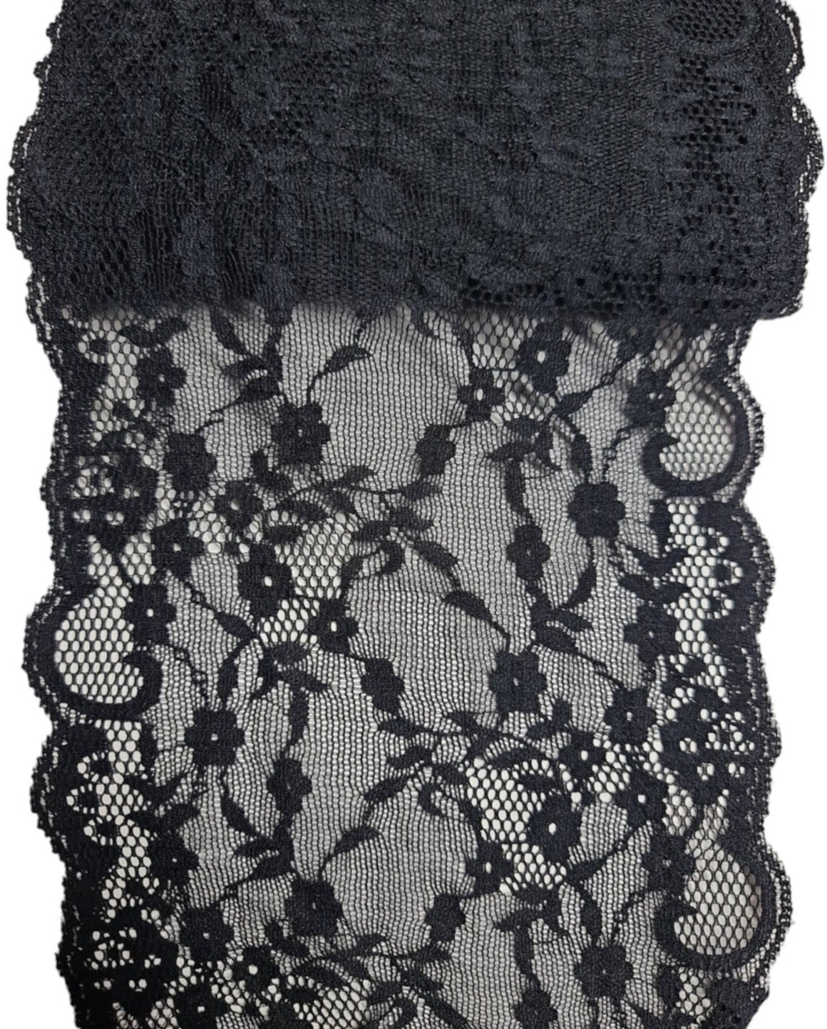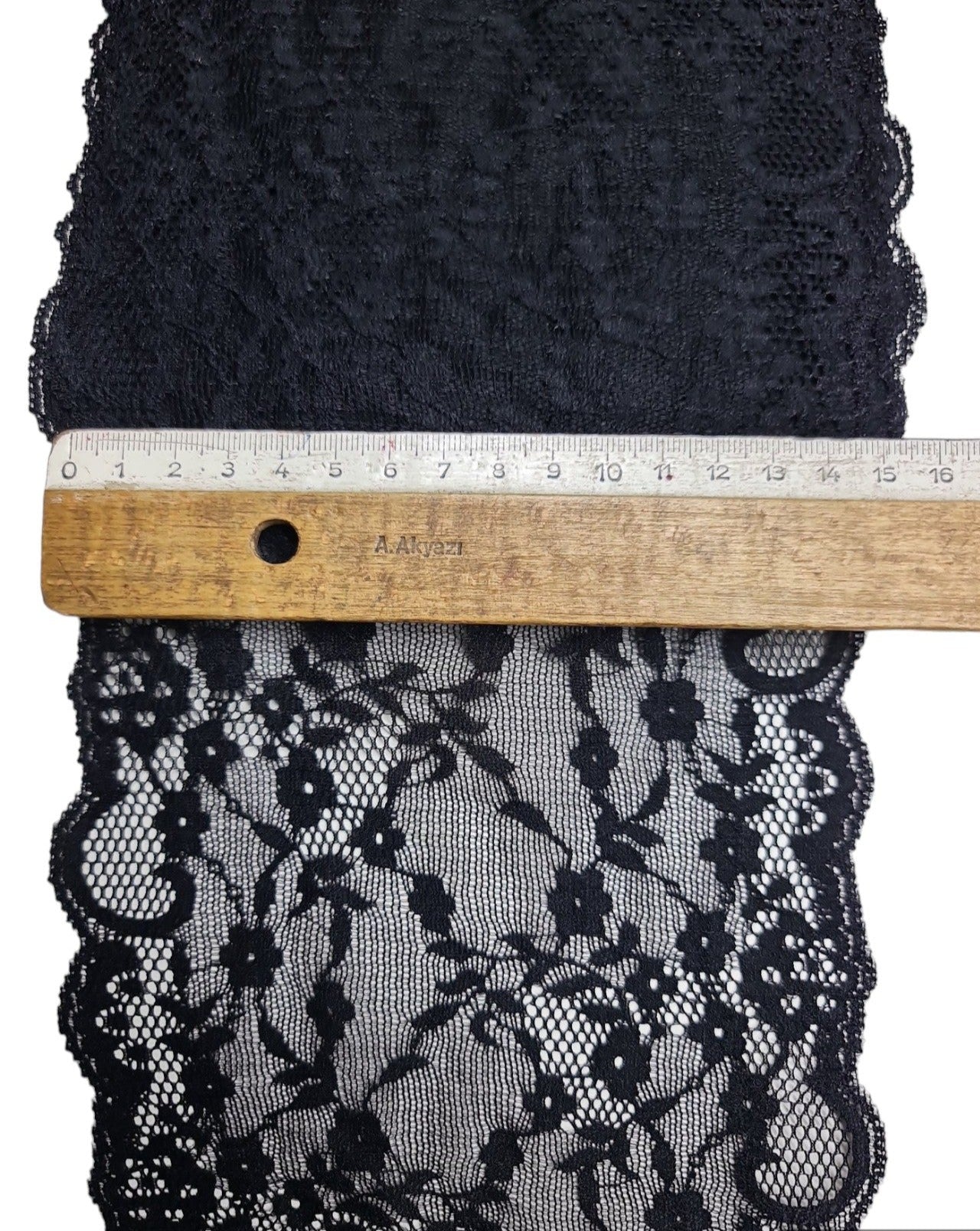 Siyah 15cm Eninde Likralı Dantel (10 Metrelik Top) Papatya Desenli Dantel